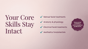 Everything you value: manual facial treatments, anatomy, physiology and electrical facial treatments, remains firmly part of the curriculum. The strong foundation you expect from us is not going anywhere. From the outset, it is important to stress that this evolution is not about reducing content. The core facial units and aesthetics fundamentals remain in place. What changes is the way those units are packaged and titled, to better reflect VTCT’s updated qualification framework and to give you a more official, recognised and future-proof route through facial and aesthetics training.