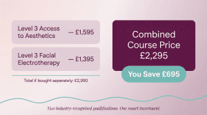 By enrolling on the combined pathway rather than taking each qualification separately, you benefit from a substantial saving while still gaining the full Level 3 Access to Aesthetics and Level 3 Facial Electrotherapy awards. For serious, career-focused learners, this offers both academic and financial value.