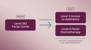 With this in mind, we are refining the way we structure our facial and aesthetics pathway. What many of you currently recognise as our Level 2 & Level 3 Facials combined course (Level 2 & 3 Facial Combi) will soon be delivered through a streamlined, VTCT-led Level 3 route that combines VTCT Level 3 Aesthetics with VTCT Level 3 Facial Electrical. In practice, this means your journey is being upgraded into two outstanding qualifications: